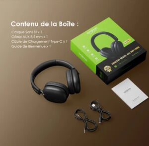 casque sans fil x 1, Câble AUX 3,5 mm x 1, Câble de chargement de type C x 1, Guide de bienvenue x 1